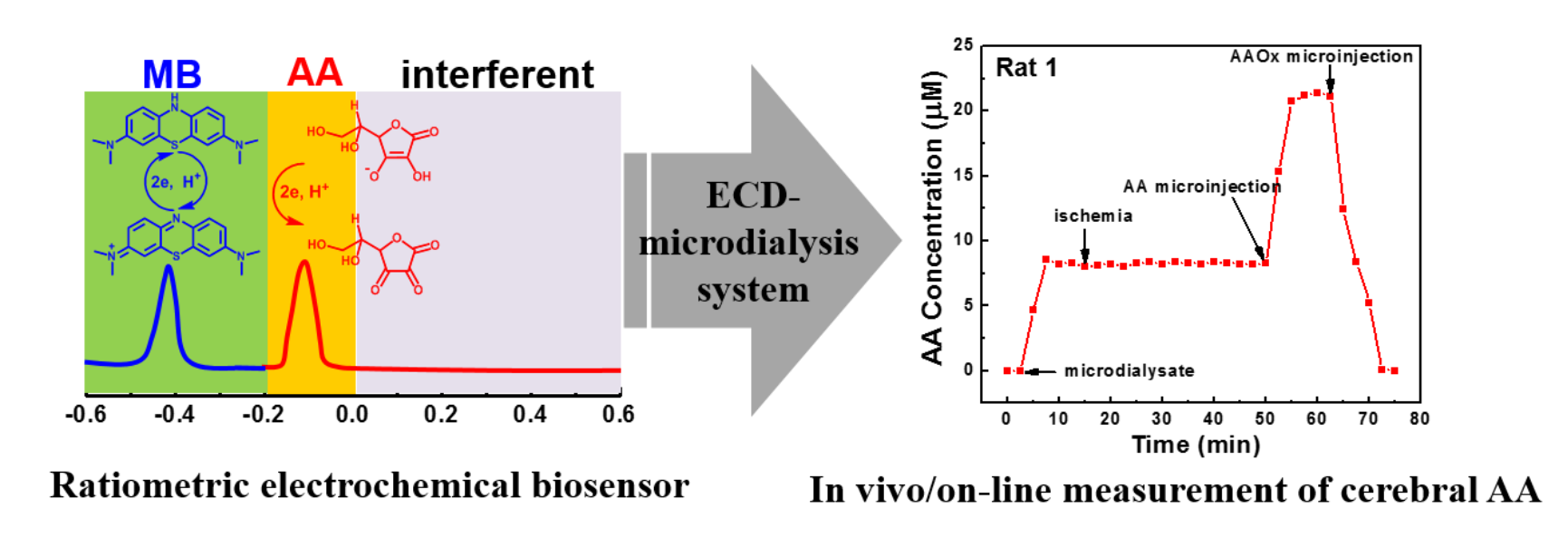 抗坏血酸(AA)是大脑中最重要的神经化学物质之一,在脑功能障碍/损伤中起着重要的神经保护和神经调节作用,而脑内AA水平的显著变化与神经退行性疾病有密切的关联。研究表明,AA具有潜在的疾病诊断价值,并对神经退行性疾病和缺血性中风有治疗功能。因此,探索简便有效的平台实现脑AA的体内/在线检测具有重要的意义。