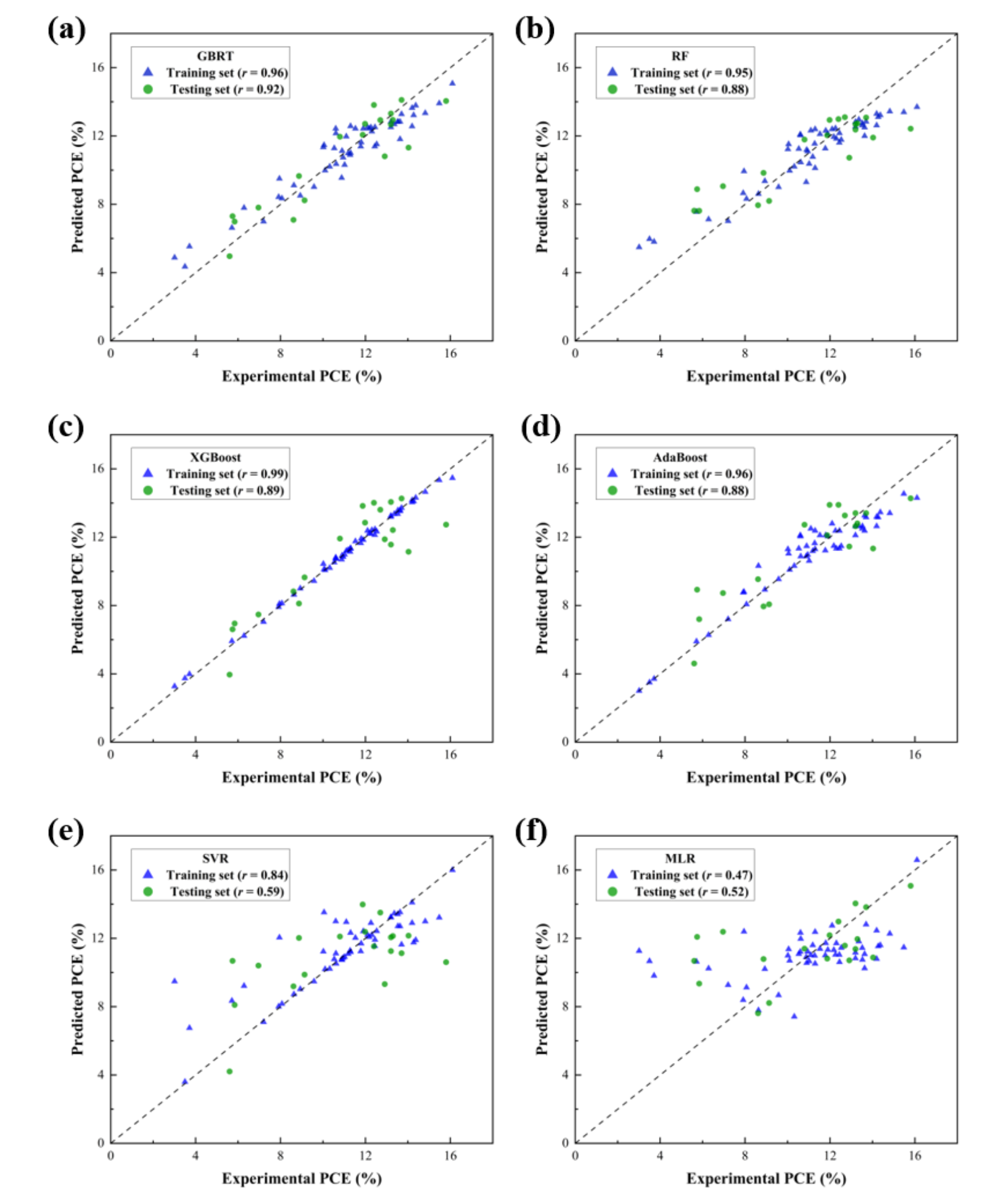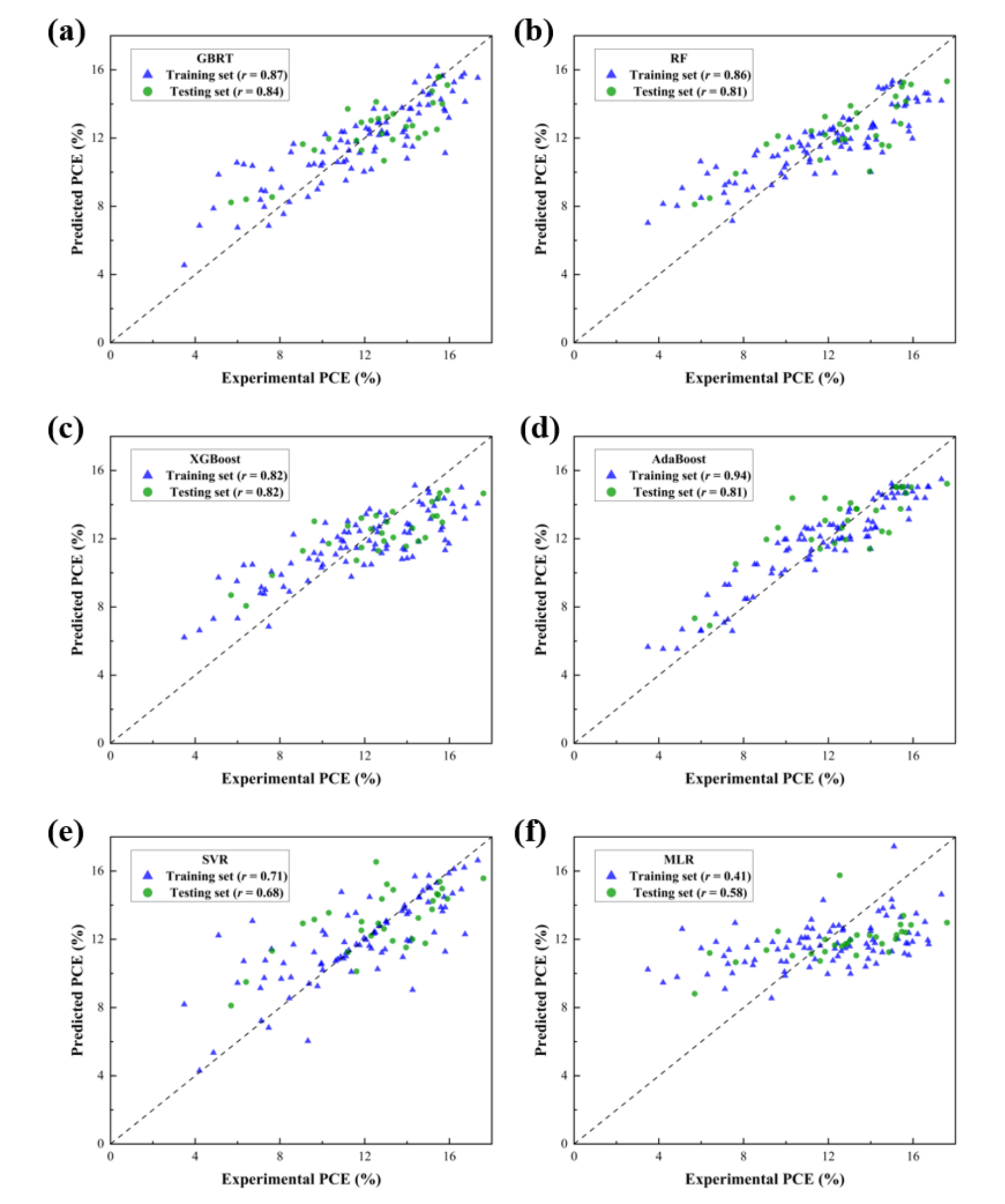 图4基于聚合物供体的机器学习预测结果值与实验值进行比较。(a) GBRT,(b) RF,(c) XGBoost,(d) AdaBoost,(e) SVR和(f) MLR。对角线表示完全正相关(r = 1)。 |