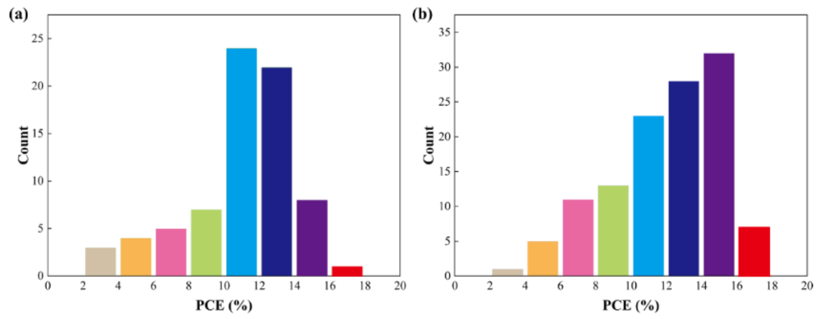 图1基于Y6受体的二元OSCs分布直方图。(a)小分子供体,(b)聚合物供体。 |