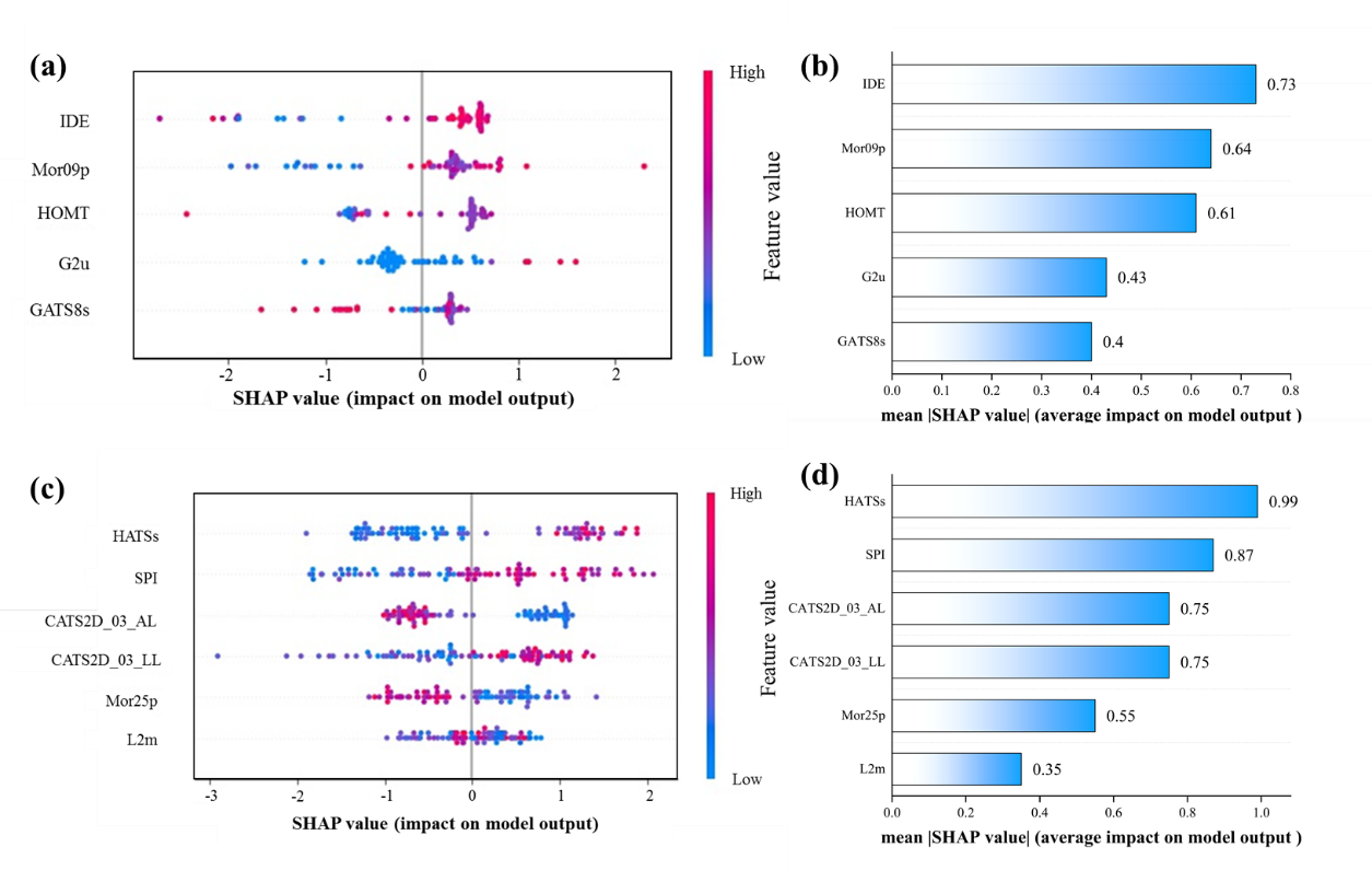 图5GBRT模型的SHAP分析。(a) (b) 基于小分子供体;(c) (d) 基于聚合物供体。 |