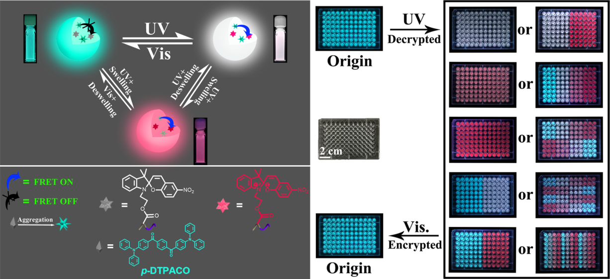 近日,球盟会理论有机化学与功能分子教育部重点实验室的陈建教授研究团队报道了利用细乳液聚合法,将具有AIE效应的给体荧光染料 1,4-苯基-双((4-二苯胺基)苯基)甲酮( p -DTPACO)和受体(螺吡喃)及单体(苯乙烯)共聚合制备新型双色光开关荧光聚合物纳米粒子。结果表明,通过优化给体-受体比例,该聚合物纳米粒子具有光和溶剂可调的开关对比度和发光颜色。另外,该团队还利用调控FRET效率的策略成功制备了具有开关可调至稳定白光的纳米粒子,并进一步将上述光开关荧光聚合物纳米粒子应用于数据加密。该研究对光开关荧光纳米材料在数据加密,显示照明和生物成像等领域具有潜在应用价值。