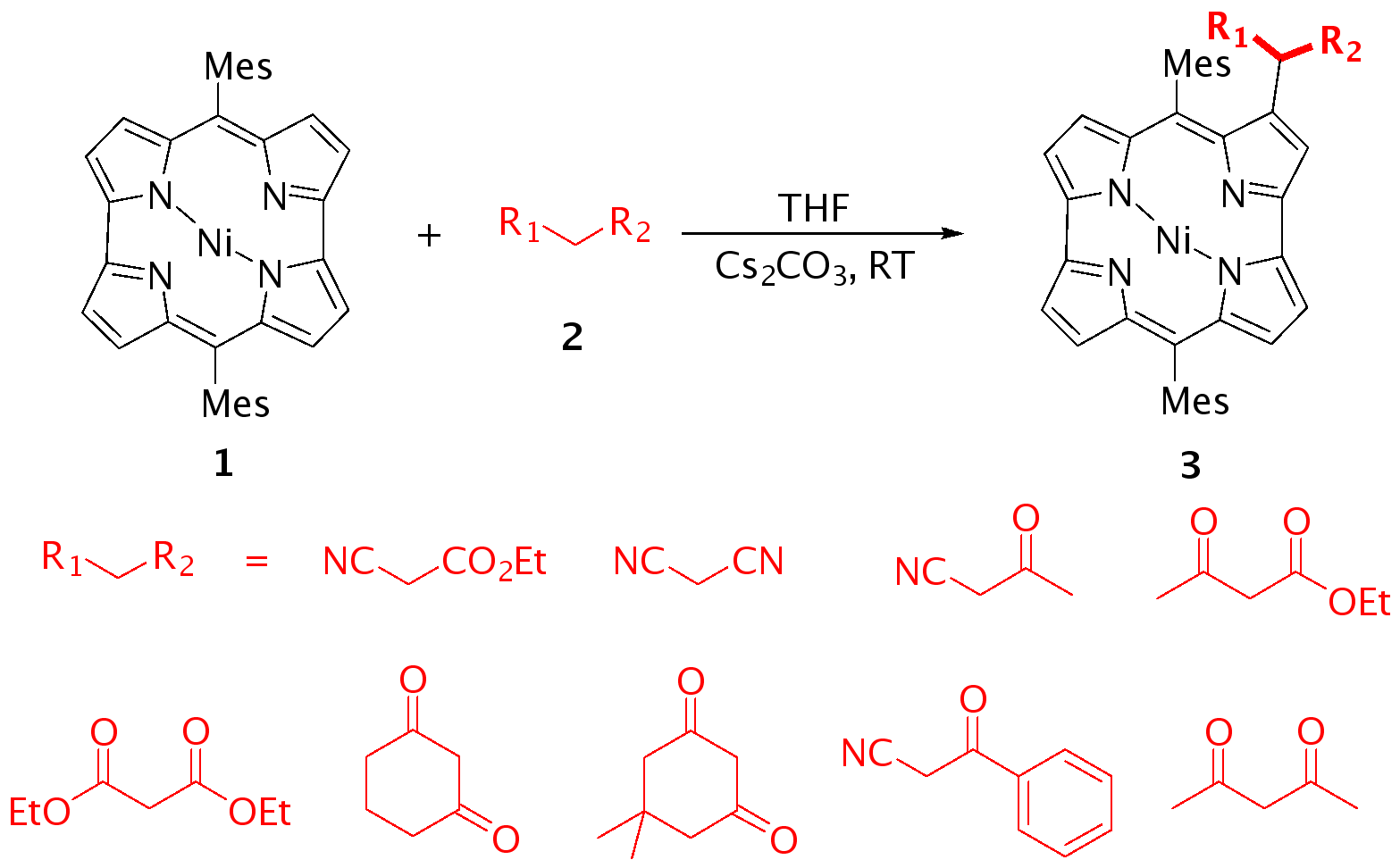 卟啉的衍生化反应对卟啉的应用研究具有重要意义。公司李筱芳教授研究小组在卟啉衍生化反应的前期工作基础上(Org. Chem. Front., 2019,6,908-918;Chem. Commun., 2018, 54, 2510-2513;Angew. Chem. Int. Ed. 2017, 56, 10810-10814;Angew. Chem. Int. Ed. 2016, 55, 13142 –13146),本研究进一步报导了在室温下,具有两个吸电子基团的活性亚甲基化合物,如2-氰基乙酸乙酯,3-氧代丁腈,环己烷-1,3-二酮,丙二腈,戊烷-2,4-二酮和乙酰乙酸乙酯,与反芳香的去甲咔咯在碳酸铯存在下区域选择性合成新型去甲咔咯衍生物。所得到的去甲咔咯衍生物保留了起始大环的光谱,磁性和氧化还原性质。
