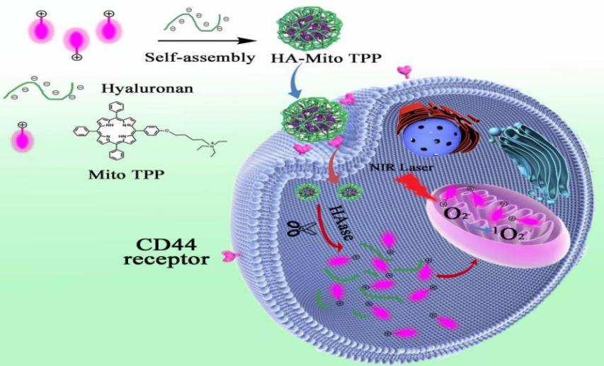 图(一):荧光纳米探针HA-Mito TPP检测HAase及光动力治疗示意图
