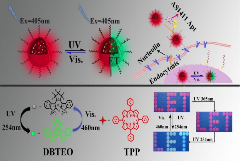 由于复杂的内部环境,在荧光成像中,细胞内的一些大分子如荧光蛋白等产生的荧光信号易干扰成像效果,甚至产生假阳性。光开关荧光聚合物纳米粒子,可在光的作用下相互转换其分子结构,可逆地转换荧光发射,为细胞成像的抗背景研究,提供了有力工具。基于此,发展了一种具有完全零串扰的特定颜色的光开光双色荧光聚合物纳米粒子。该纳米粒子通过结合光开关荧光分子二芳基乙烯和具有较大斯托克斯位移的红色荧光染料四苯基卟啉(TPP)到PMMA纳米颗粒中。通过合理的比例设计,该纳米粒子显示出高的荧光对比度,零串扰双色荧光特性,以及不同的光开关荧光信号。实验结果表明,将核酸适配体AS1411交联到纳米探针表面后,可实现靶向癌细胞的光开关双色成像。此外,我们还将该纳米粒子应用于信息加密、防伪及可擦写荧光图案。该工作成果发表在Dyes and Pigments上(SCI一区,IF4.889),于2021年4月在线发表。湘潭大学-球盟会联合培养硕士刘乐为本文第一作者,公司张崇华博士、陈建教授和湘潭大学高勇教授为共同通讯作者,球盟会为第一单位。