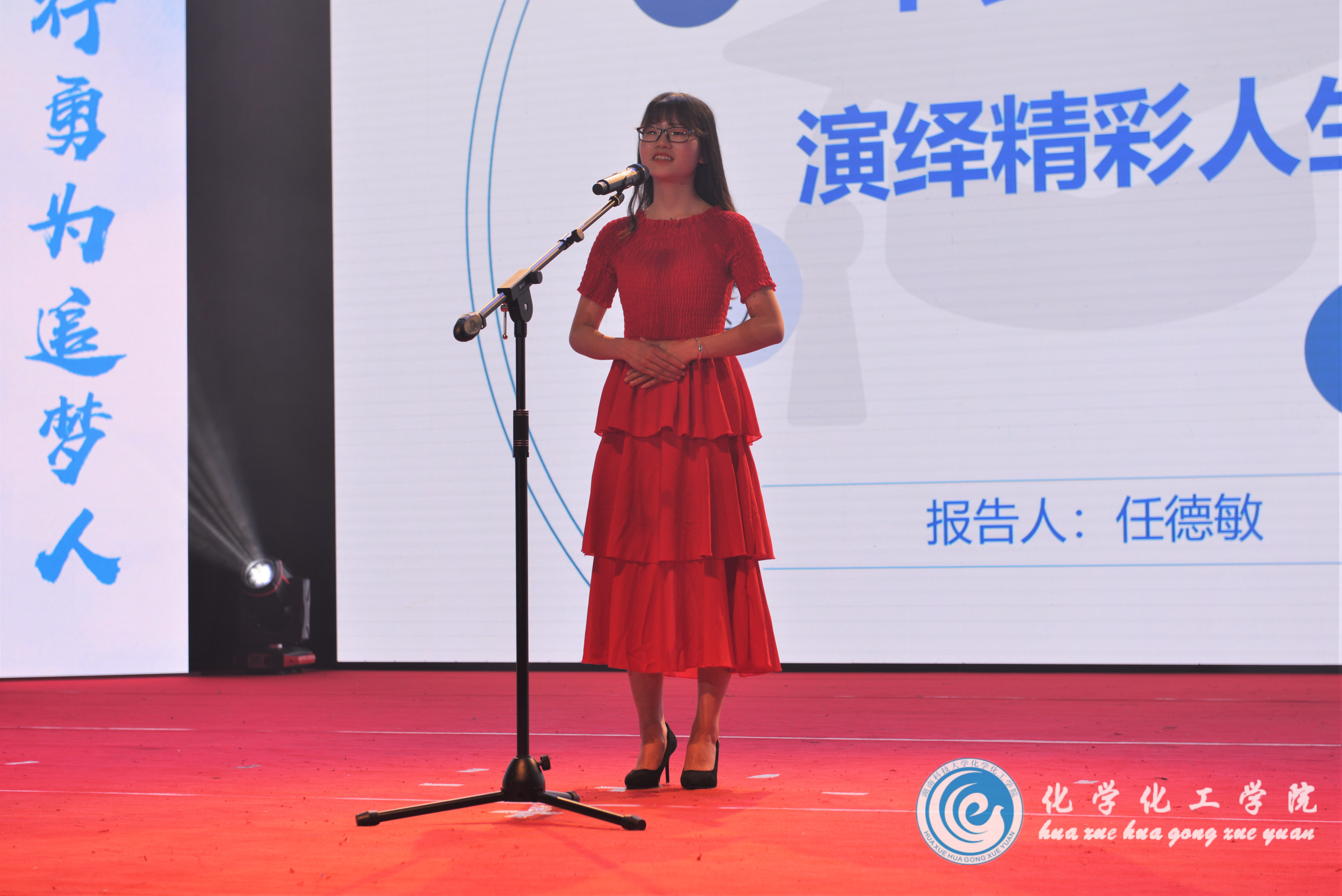 “强者之所以强,是因为他能从深渊中迸发新的力量”,作为本场第五个出场的选手,任德敏与大家分享了自己进入实验室的心路历程。在经历多次实验失败后,她并没有放弃,而是反复修改实验方案并优化实验数据。功夫不负有心人,她的实验终于初见成效。实验室里装满废液的大白桶和记满实验数据的记录本则是她成功最好的见证。任德敏在报告中传达的不畏艰辛的实验精神,不仅展示了属于她自己的精彩人生,更鼓舞了在座的化工学子。同学们纷纷高呼:“德才兼备,敏而好学;化工德敏,冰雪聪明”的口号为其呐喊助威。