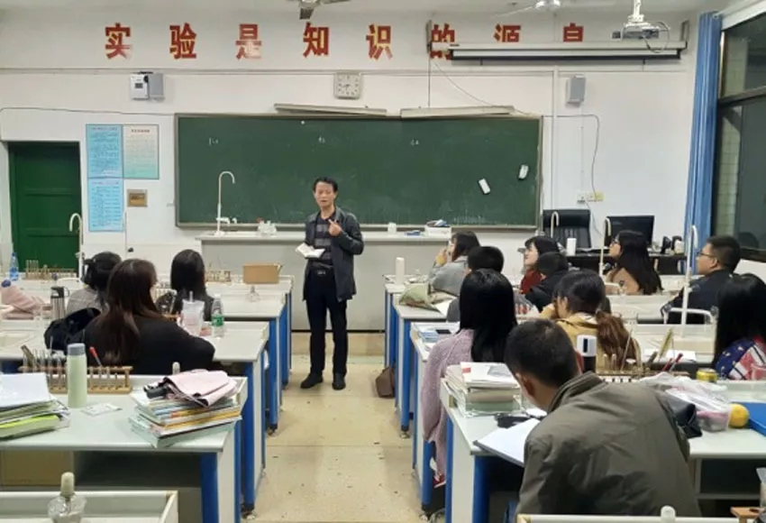 听自己指导老师课,听其他同学的指导老师课,在听课过程中,感受课堂教学常规。从编写教案、修改教案、试讲、磨课、再试讲,一次一次的发现问题、修改问题,实习老师们在带队老师和化学指导老师指导下最终走向讲台。课后,指导老师都会就课堂教学中存在的问题进行面对面指导。通过这样的活动,让实习老师们懂得如何真正雕琢、真正精致自己的课堂。