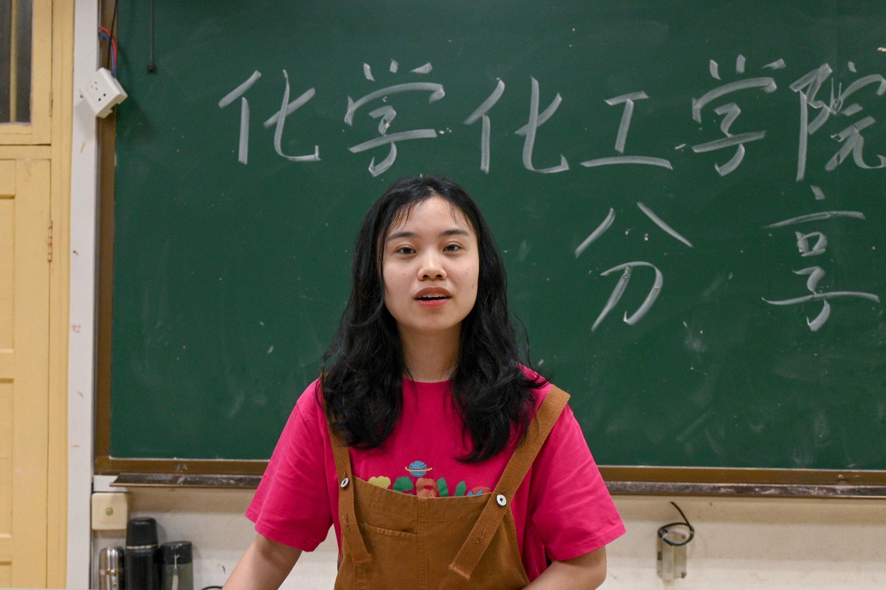 “星光不问赶路人,时光不负有心人。”应用化学专业的王央同学在分享中提到大一时担任了班干和员工会干事对她有重要影响,丰富的任职经验也使她在今天的分享会上更加从容。关于学习方法,她指出课堂要上认真听课,课堂之余找到适合自己的方法,多留意真题,认真完成老师布置的题目。最后,她鼓舞同学们充分发挥自己的潜力,在老员工活中持续发光。