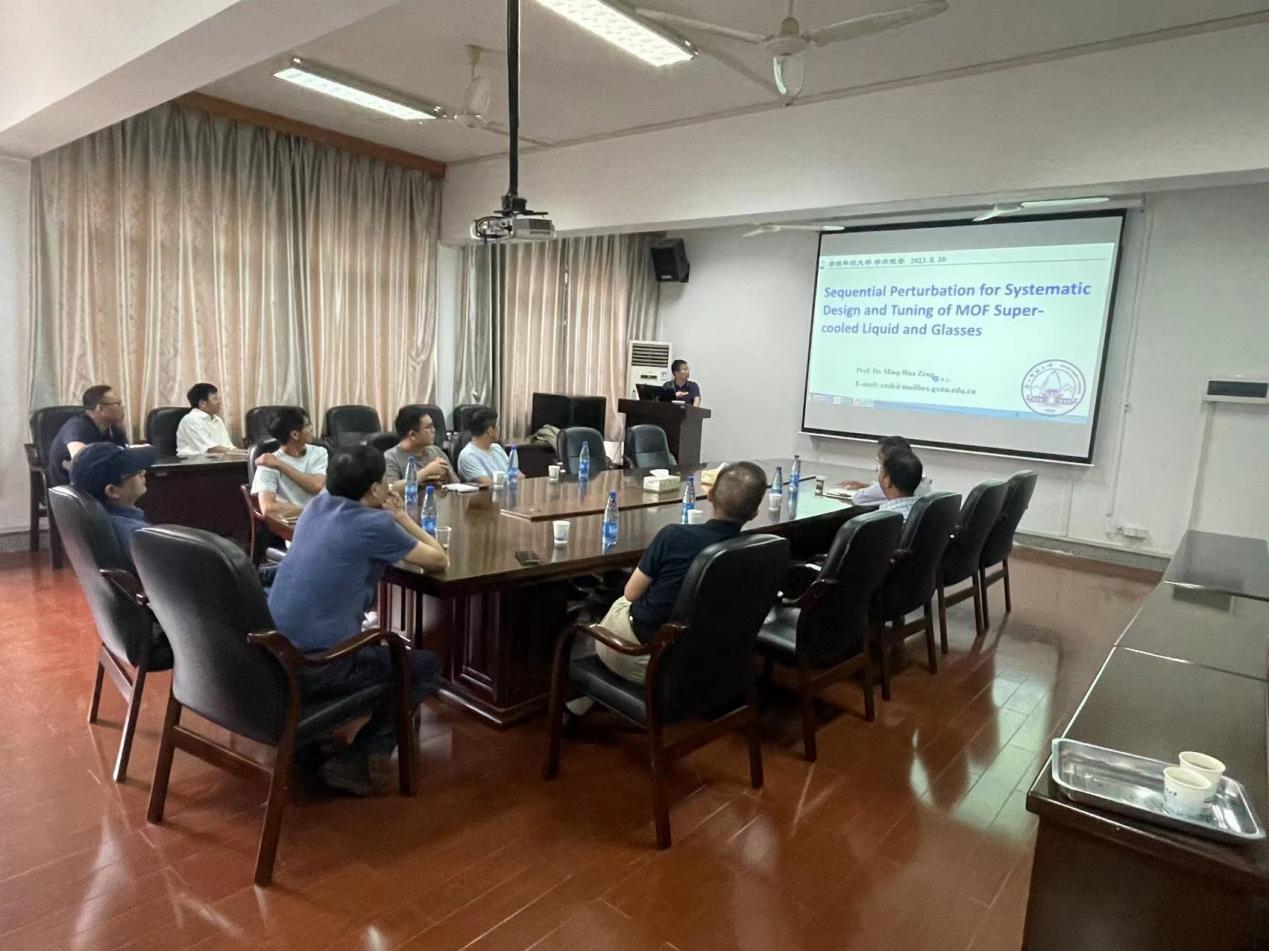 报告会上,曾明华教授分三层详细介绍了MOF过冷液体和玻璃系统设计的影响因素。首先是需要选择合适的MOF材料,由于MOF具有高度可调的结构和性质,选择适当的金属离子和有机配体组合可以调控MOF的孔隙结构、分子互作用力以及物理性质,从而影响过冷液体和玻璃的形成能力。其次,在设计过程中需要考虑温度、压力和组分等参数对过冷液体和玻璃形态的影响。通过调节这些参数,可以实现MOF材料的过冷液体转变为玻璃的过程。最后,在MOF过冷液体和玻璃系统设计中,还需要考虑材料的稳定性和可控性。由于MOF材料的特殊性质和结构,它们在形成过冷液体和玻璃时可能面临结构坍塌或相变失效等问题,因此,需要通过调整合适的条件和结构来提高MOF材料的稳定性,并确保其可控性。