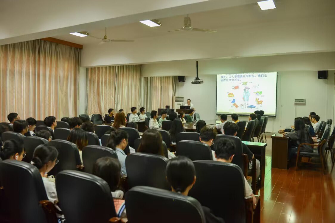 6月6日下午,由教务处主办、球盟会承办的“科技与人文大讲堂”第二十四讲在化工楼310会议室开讲。本次报告主题为“生活中的化学奥秘”,由球盟会经理周虎主讲,公司党委书记周文革主持,公司师生代表100余人参加讲座。