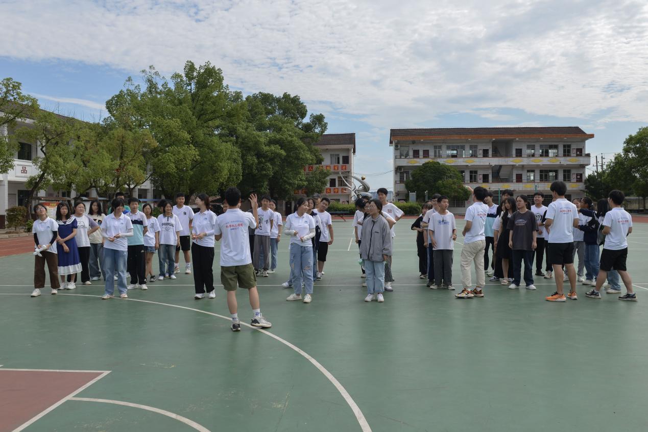 赛前,志愿者们带领着同学们做热身运动,讲解比赛规则,强调本次趣味运动会的注意事项,叮嘱同学们若有身体不适要立刻向志愿者反映,在运动中做好防护措施。