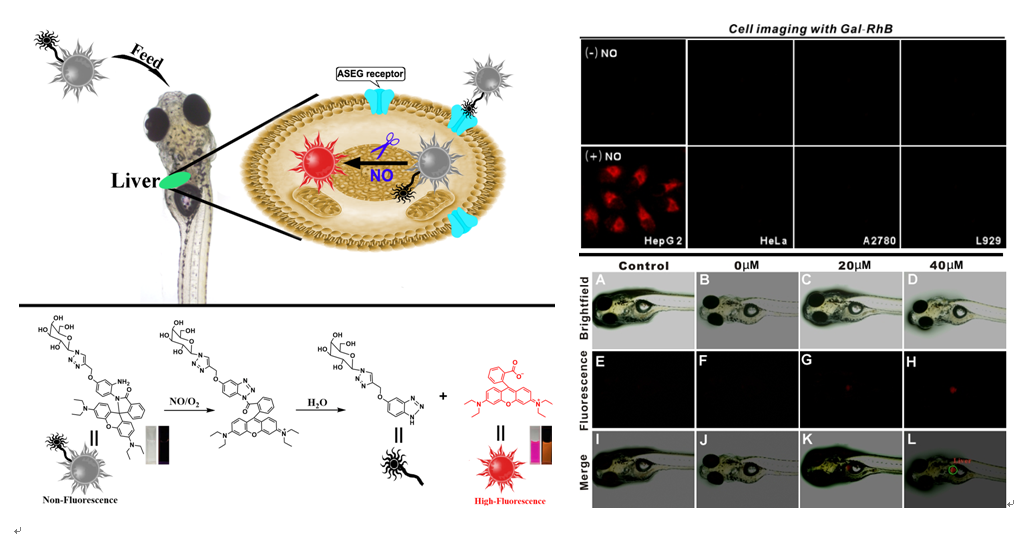 近日,球盟会理论有机化学与功能分子教育部重点实验室的张培盛博士研究团队首次报道了一种肝靶向NO荧光探针(Gal-RhB),实现了斑马鱼内肝脏中NO的原位成像检测。Gal-RhB以市售罗丹明B为母体结构,通过将邻苯二胺(NO识别基团)和半乳糖(肝靶向基团)引入罗丹明B结构中,构建了肝靶向NO荧光探针(Gal-RhB)。半乳糖基团的引入不仅增加了探针的水溶性,也有利于探针被肝细胞特异性摄取。细胞和活体成像研究表明:该荧光探针(Gal-RhB)能够被肝细胞特异性摄取,并应用于肝细胞和肝脏中NO的荧光成像分析。该研究对进一步了解NO与肝脏相关疾病的发生发展作用研究具有重要的意义。