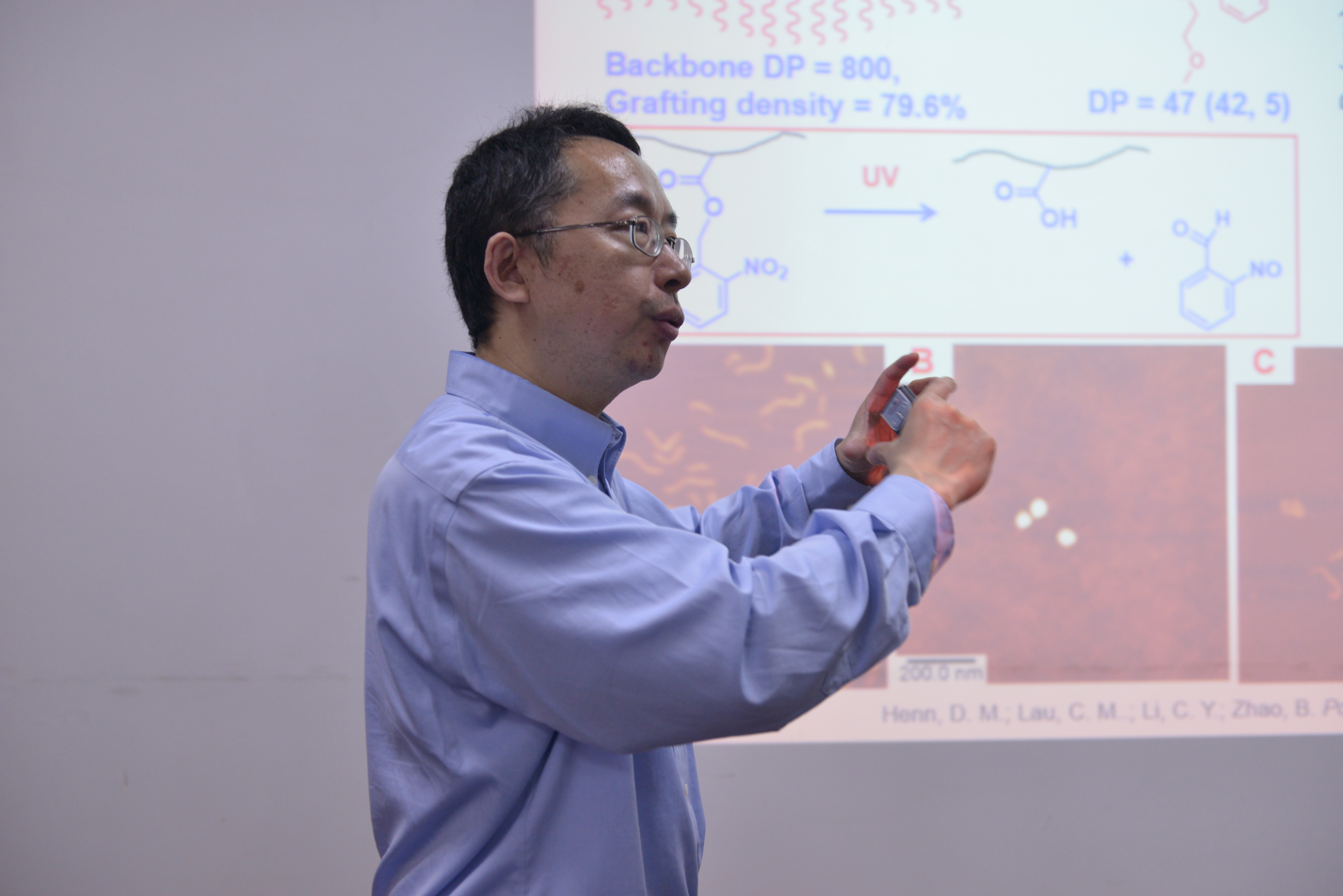 5月6日下午4点,应公司和理论有机化学与功能分子教育部重点实验室邀请,美国田纳西大学赵斌教授在化工楼310学术报告厅,以“Macromolecular Brush Materials(高分子刷材料)”为主题作了一场精彩的学术报告。报告会由理论有机化学与功能分子教育部重点实验室主任唐子龙教授主持,球盟会、理论有机化学与功能分子教育部重点实验室师生80余人到场聆听。